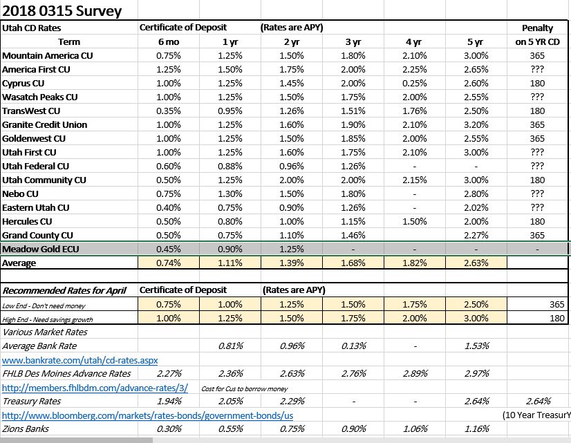 - A member could invest in a 6 month treasury bill and get an .87% return. The average CD at a Utah Credit Union is .36%. We’ll soon have to be paying at least .90% for a 6 month CD. But don’t rush.